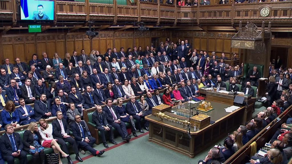 Он поблагодарил Великобританию за поддержку, призвав правительство ужесточить дальнейшие санкции для защиты неба Украины, хотя введение бесполётной зоны — это рискованный шаг, на который Великобритания и её союзники пока не готовы пойти. Тем не менее, сообщение Зеленского вызвало слёзы у некоторых депутатов, поскольку он бросил вызов тирании, уходящей своими корнями в коммунизм.