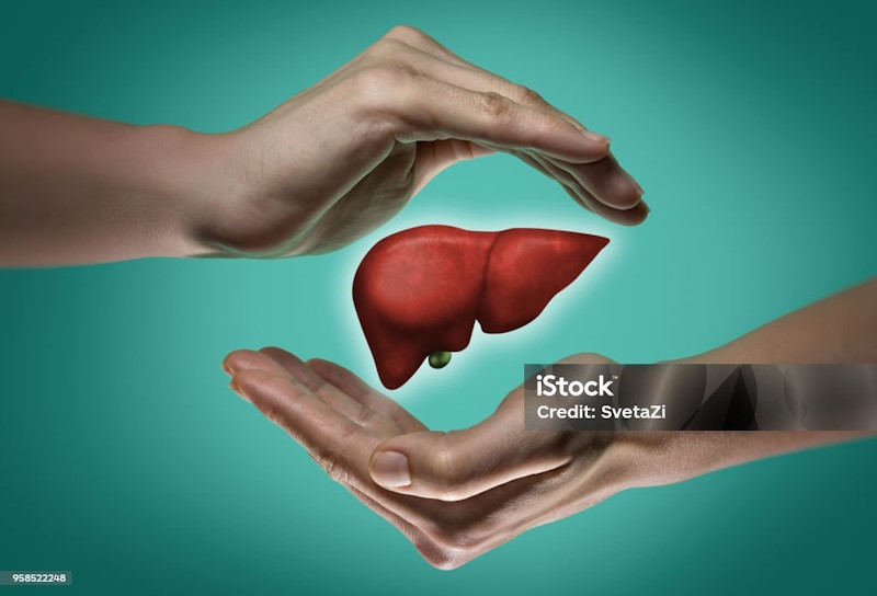 A human liver between two palms of a woman on blue and green background. The concept of a healthy liver.
